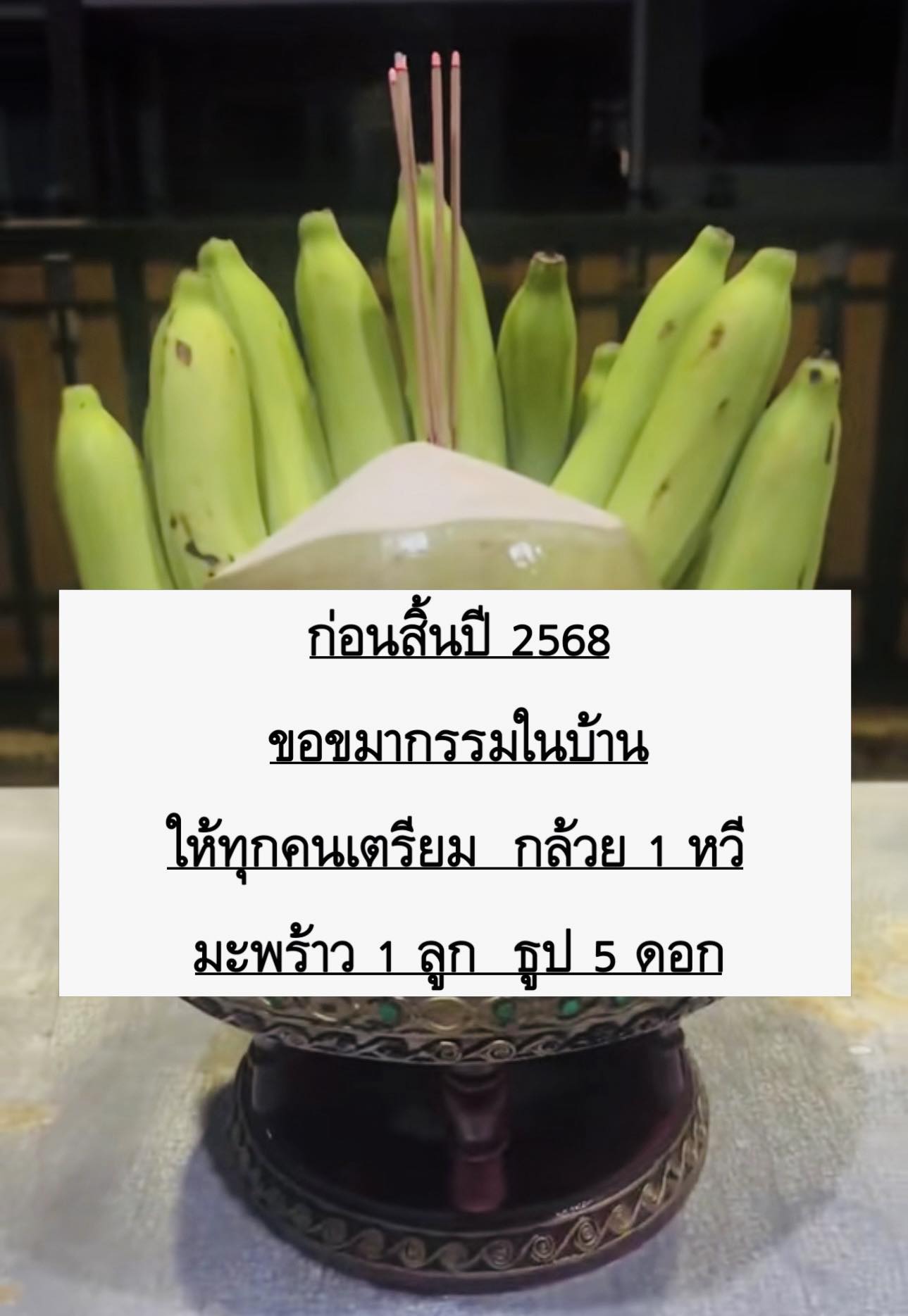 กล้วย 1 หวี มะพร้าว 1 ลูก ธูป 5 ดอก พร้อมใจที่มีความศรัทธา จุดหันหน้าออกหน้าบ้าน กล่าวว่า